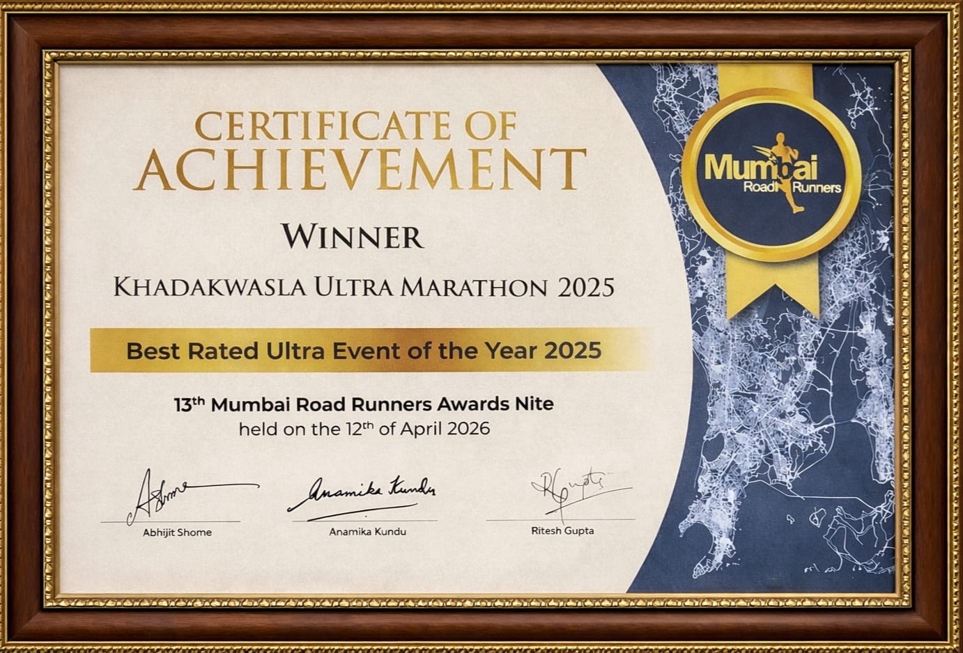 We are proud to be recognized as the Best Rated Ultra Event of the Year 2025 at the prestigious 13th Mumbai Road Runners Awards Nite. This achievement reflects the passion, dedication, and spirit of every runner, volunteer, and supporter who h as been part of the Khadakwasla Ultra journey..